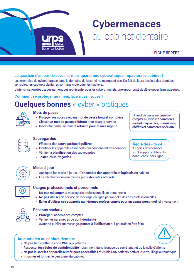 L’URPS Chirurgiens-Dentistes Nouvelle-Aquitaine met à votre disposition une ressource claire et accessible : cliquez ici pour télécharger la fiche repère « Cybermenaces au cabinet dentaire » – PDF (131 Ko)